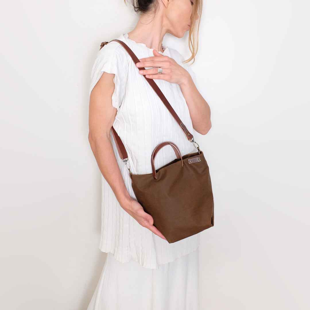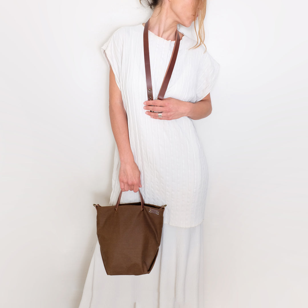 Está realizado en nuestro taller de Barcelona con tejido de loneta encerada color marrón, el mismo material de la clásica chaqueta Beaufort de la marca Barbour que tanto se puso de moda en los años 90 y ahora está en tendencia total. La tela encerada es un tejido muy resistente e impermeable que va cambiando de color con su uso y va cogiendo personalidad con aspecto más gastado, puede parecer al principio que el encerado pueda manchar pero no lo hace, es la capa protectora del tejido. Las asas son de cuero color verde oliva y la correa es regulable y extraíble por si quieres llevar el bolso sin asas.. En el interior dispone forro y un bolsillo.