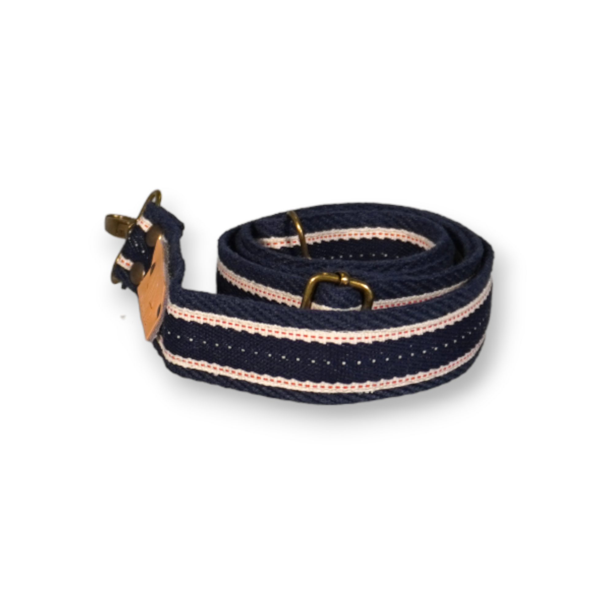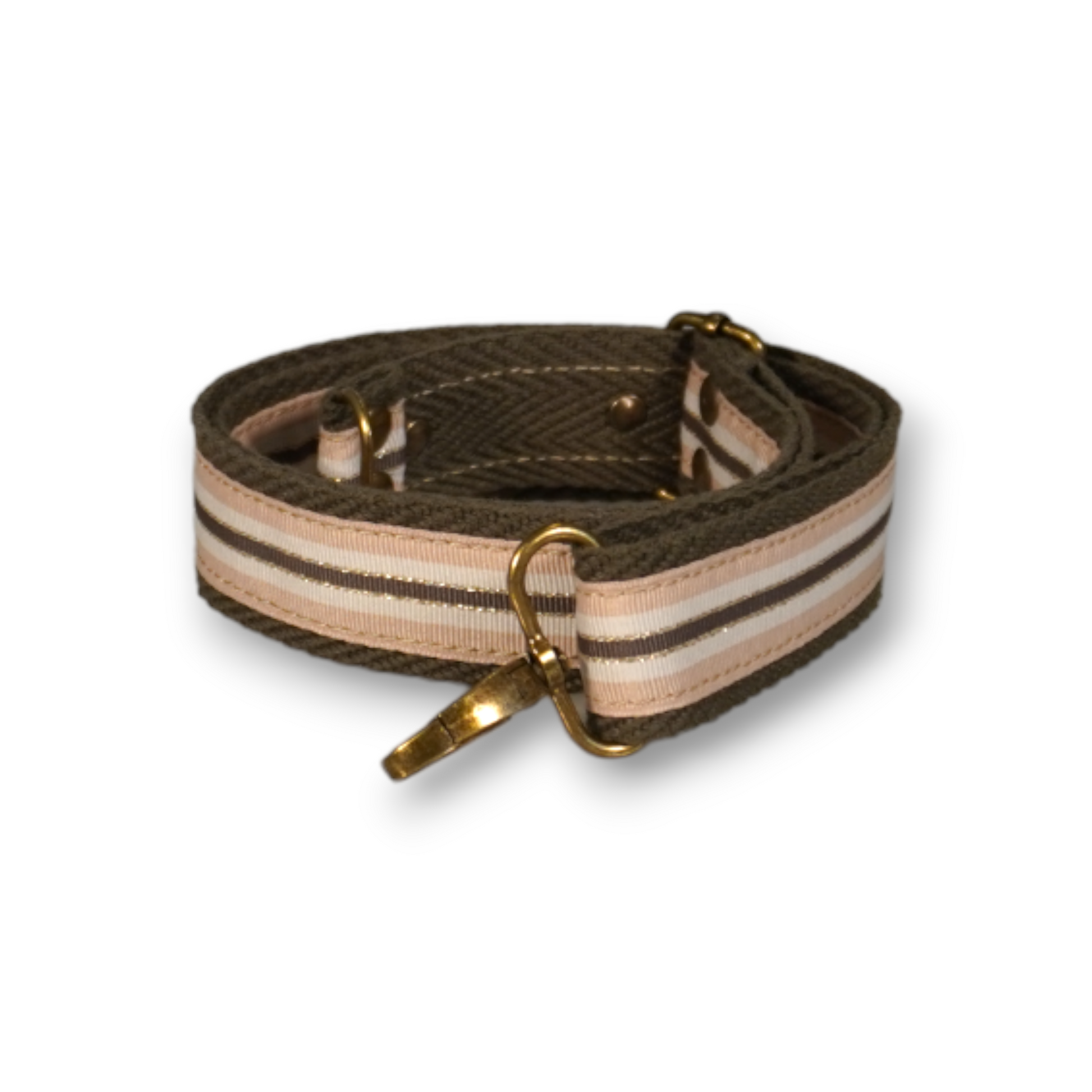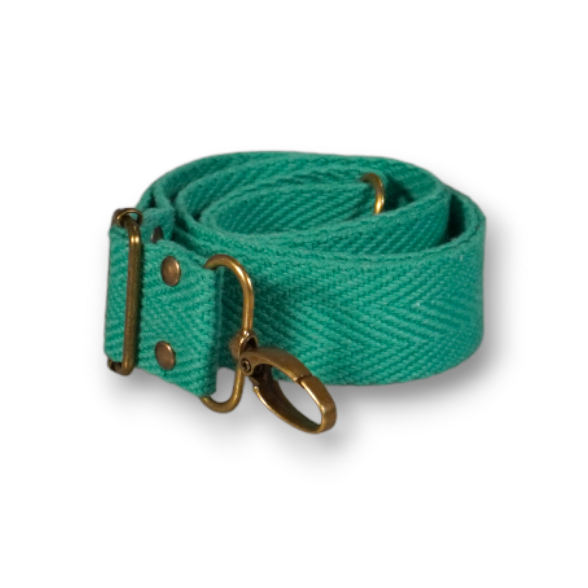 Las asas están realizadas de algodón reciclado o de piel vaquetilla y regulador y 2 mosquetones en Oro Viejo.