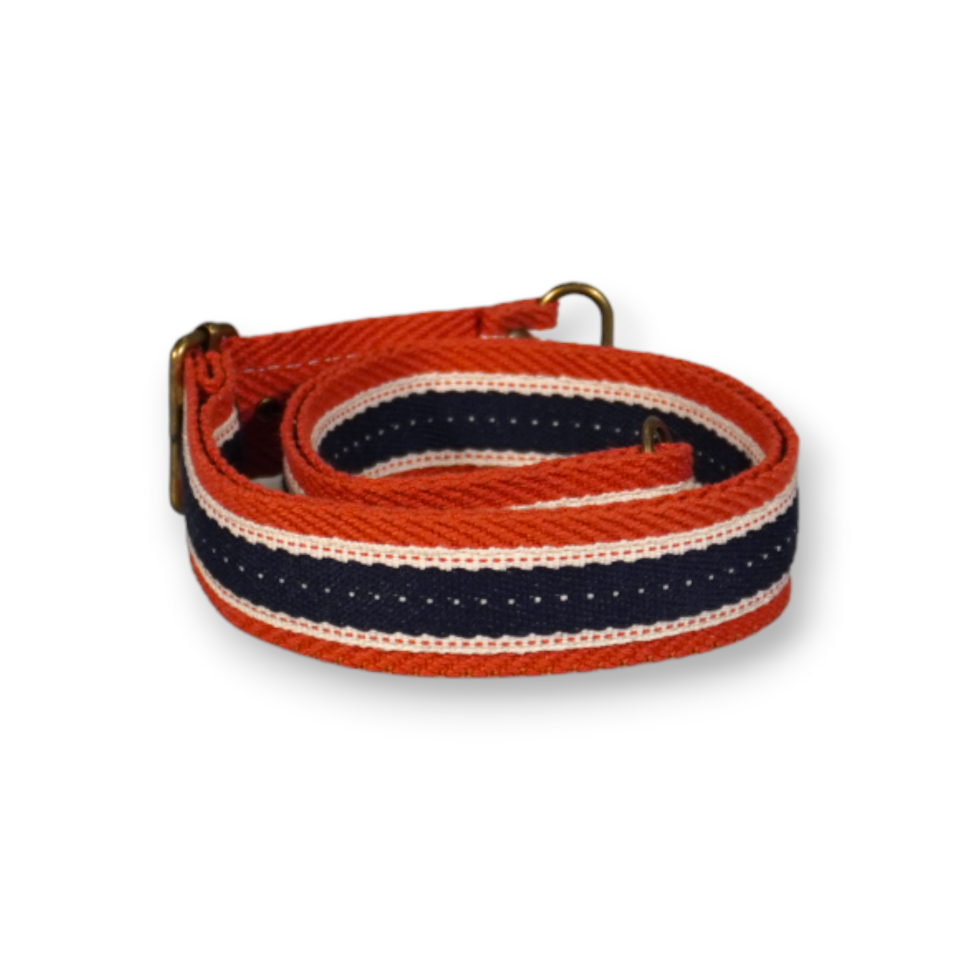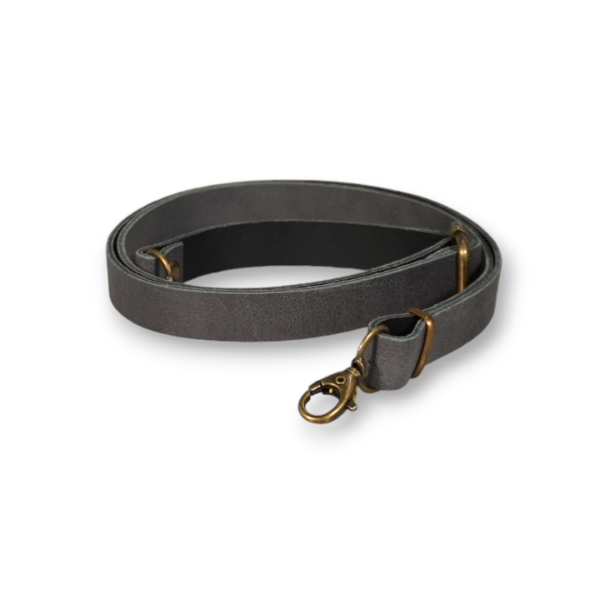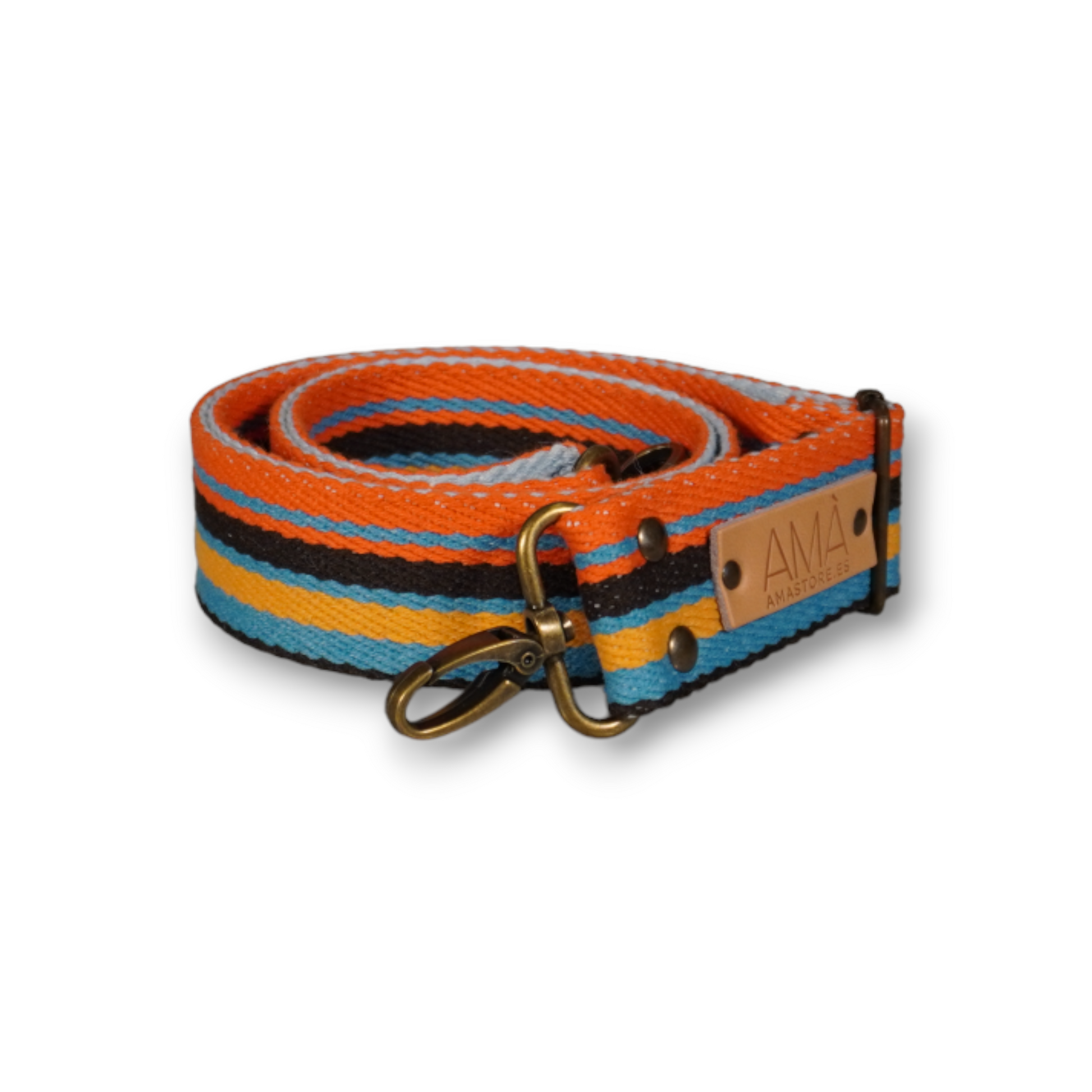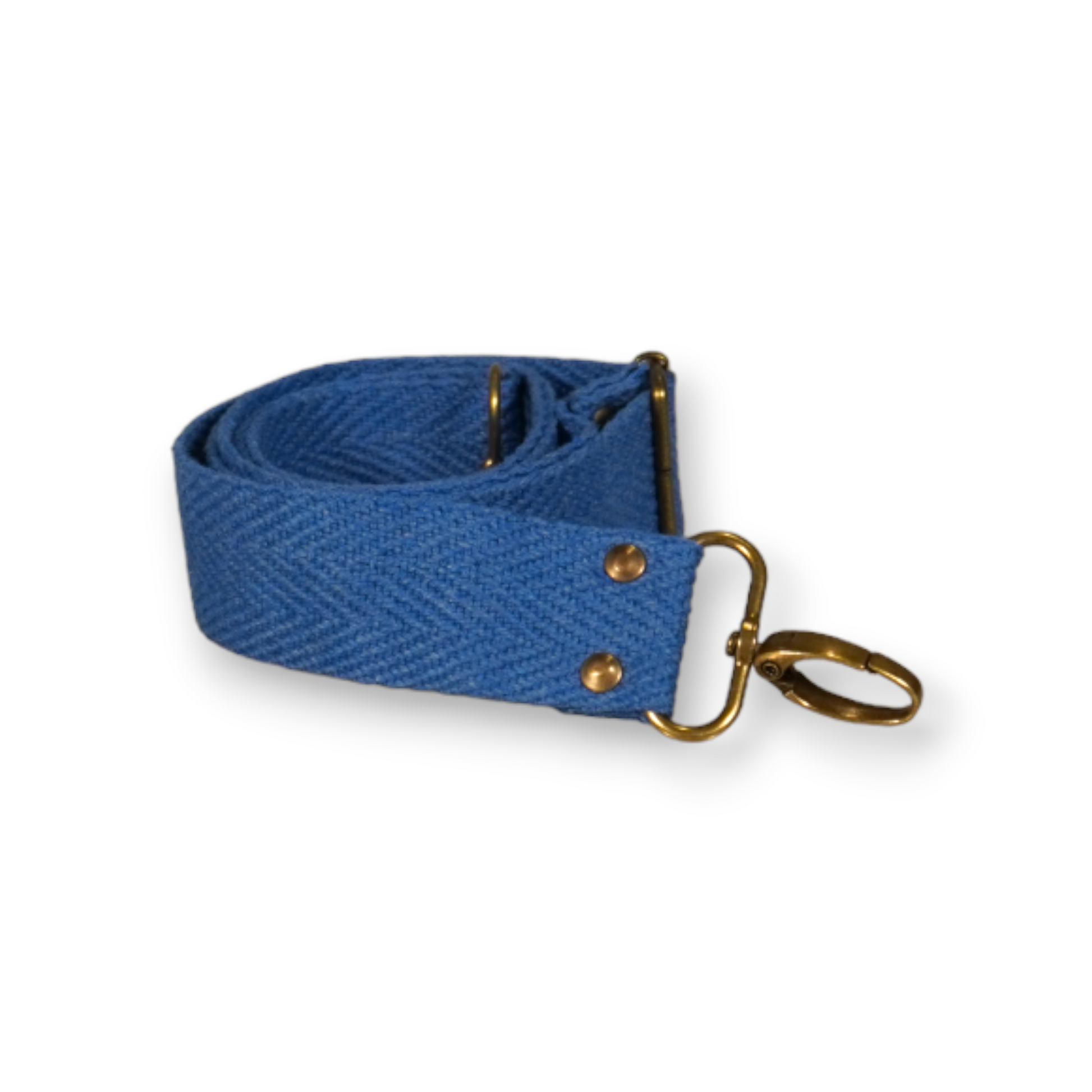 Las asas están realizadas de algodón reciclado o de piel vaquetilla y regulador y 2 mosquetones en Oro Viejo.