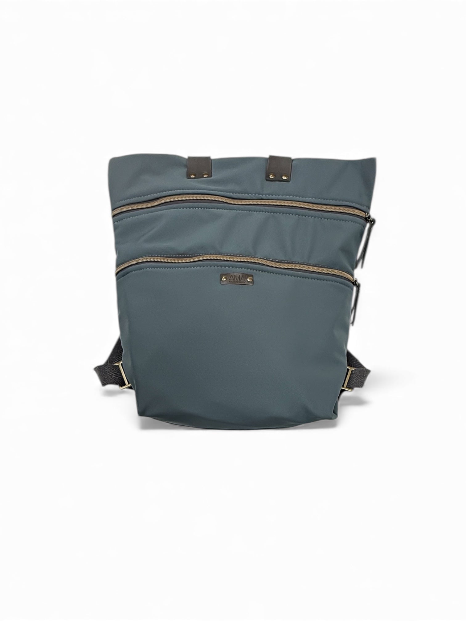 Está realizada en tejido tipo Softshell *impermeable color aceroy forro interior. Las asas son regulables y dispone de 2 cremalleras y un bolsillo interior en. Además lleva un práctico llavero extraíble para que encuentres las llaves con facilidad. Detalles en cuero color gris , si quieres una opción sin piel háznoslo saber en tu pedido y te pondremos los detalles en otro tejido